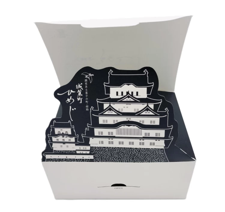 伊勢屋本店の色んなお菓子を詰め合わせた姫路城の化粧箱。白鷺城らしいシンプルで白い「城菓町ひめじ」の箱で、蓋を開けると姫路城が出てくる。姫路観光・姫路土産にぴったり。