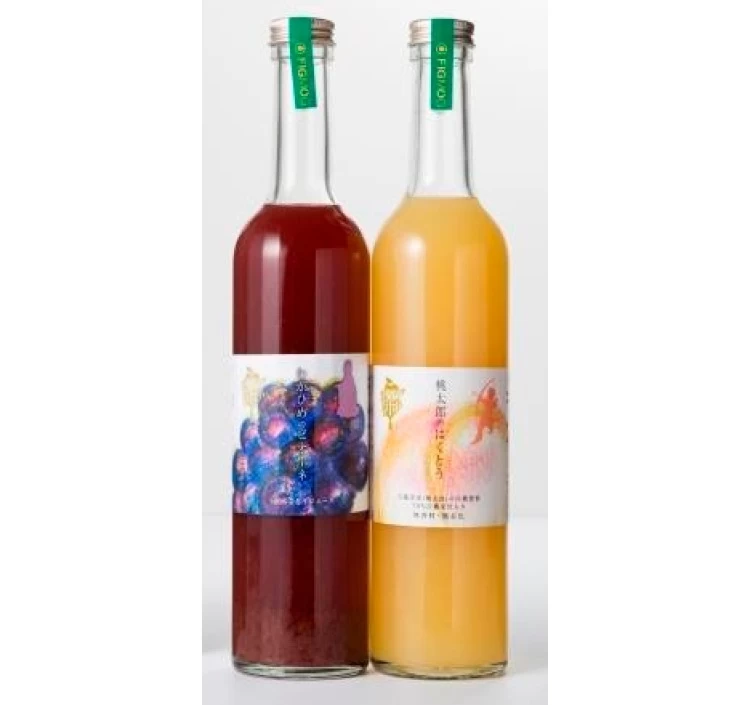完熟白桃をまるごと約3個に匹敵する果汁を入れて、とろりとした濃厚な果汁と芳醇な香りが特長の「岡山県産白桃ドリンク」と、岡山県産の高級ぶどう「ピオーネ」を自社で荒く絞り、瓶詰したストレート果汁の香り高く、濃厚な甘みの「ピオーネジュース」のセット。