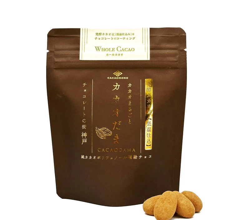神戸発 カカオ専門店 カカオものオリジナルスイーツ。低温で長時間じっくり加工した、カカオポリフェノールたっぷりの”発酵カカオ豆(ローカカオ豆)”をまるごと、ホワイトクーベルチュールチョコレートと、カカオ由来原料のみでコーティングしたプレミアムな “カカオだま”