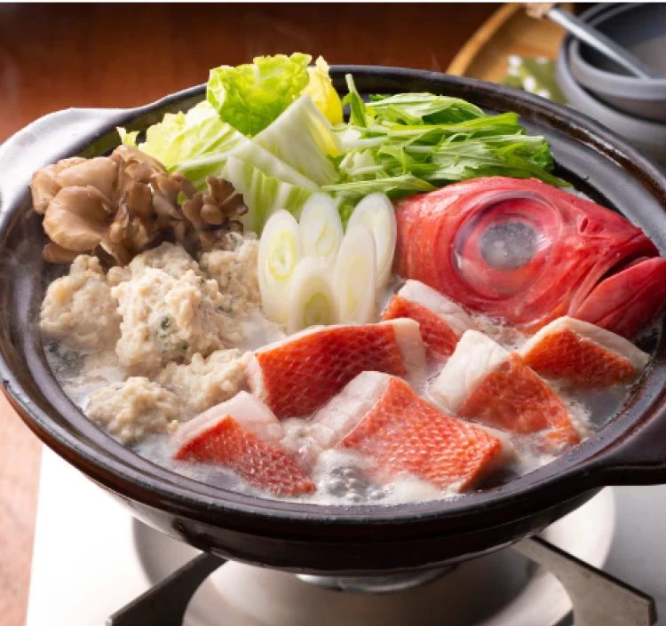 冷蔵庫で6〜7時間ほどかけて解凍し、解凍後は金目鯛を軽く水洗いします。金目鯛に付着している氷は乾燥防止用のため、洗い流してください。鍋に水を入れてカット昆布を加え、20分ほど浸してから火にかけます。沸騰する前に昆布を取り出し、金目鯛のアラ骨やカマを入れて出汁を取ります。出汁が出たら、つみれとお好みの野菜を加えて加熱し、具材に火が通ったら完成です。骨に注意してお召し上がりください。