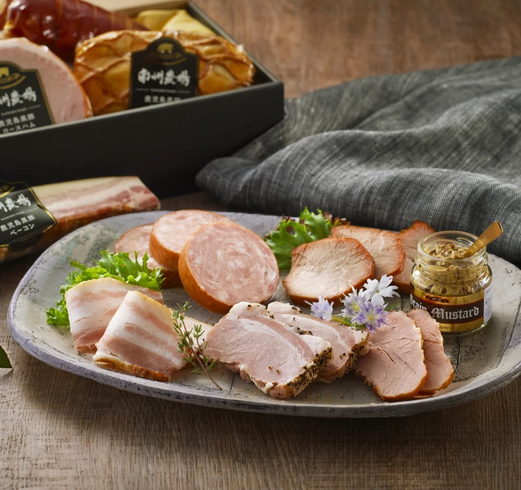 | 内容量 | ロースハム厚切り200g×1、炭焼焼豚200g×1、モモハム200g×1、ベーコン150g×1、2年熟成生ハム40g×1、荒挽きウィンナー120g×1 |