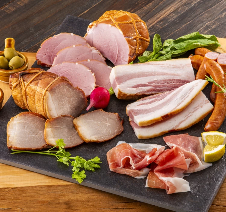 | 内容量 | 炭焼き焼豚200g×1、モモハム200g×1、ベーコン150g×1、2年熟成生ハム40g×1、荒挽きウィンナー120g×1 |