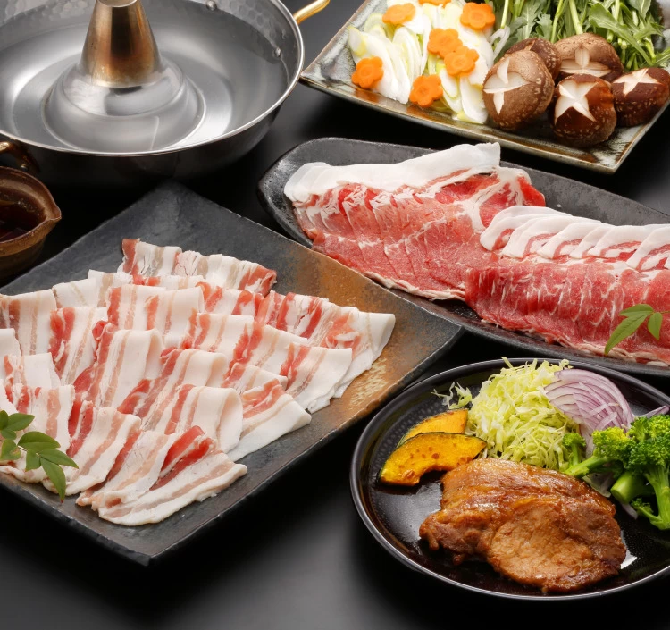 鹿児島県大隅半島にある自社農場で大切に育てた「かごしま黒豚」のみを使用した黒豚しゃぶしゃぶと、さくっと歯切れよい肉の食感と香ばしい味噌の風味が食欲をそそる「黒豚ロース味噌漬け」のセット。
