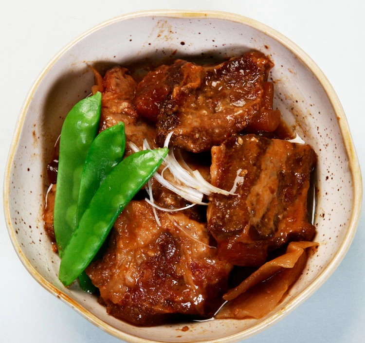 鹿児島県大隅半島にある自社農場で大切に育てた「かごしま黒豚」の骨付きバラ肉をじっくりと煮込んだ、軟骨までやわらかく食べられる逸品だ。