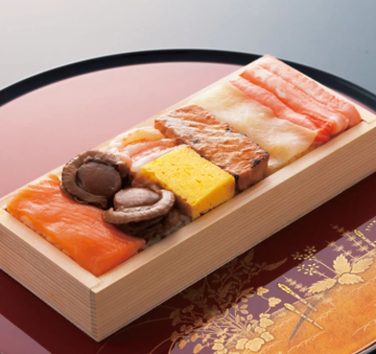 七種類の厳選素材をそれぞれに適した調理法で味付けしました。1つで様々なお味をお楽しみいただける目にも美しい押し寿司です。
