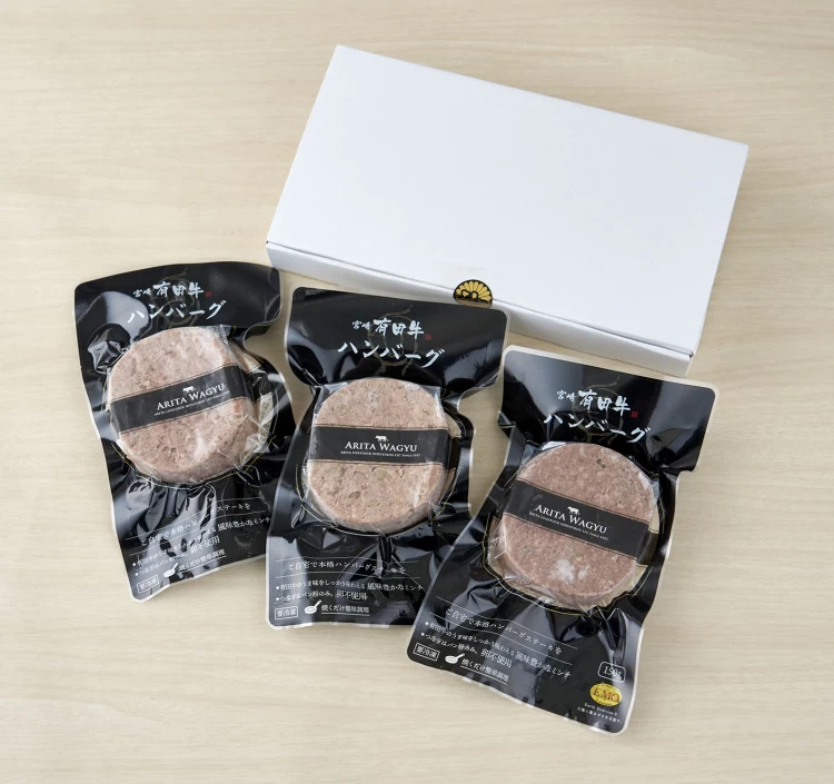 1つ1つ個別パック包装でお届けしているため、簡単に調理が可能。それぞれのハンバーグは形成後に即包装することで商品の劣化を防ぎ、作りたての美味しさをいつでも楽しめる。ブランド牛「有田牛」の旨味を凝縮した自慢の逸品は自宅用にも、ギフトにもおすすめ。