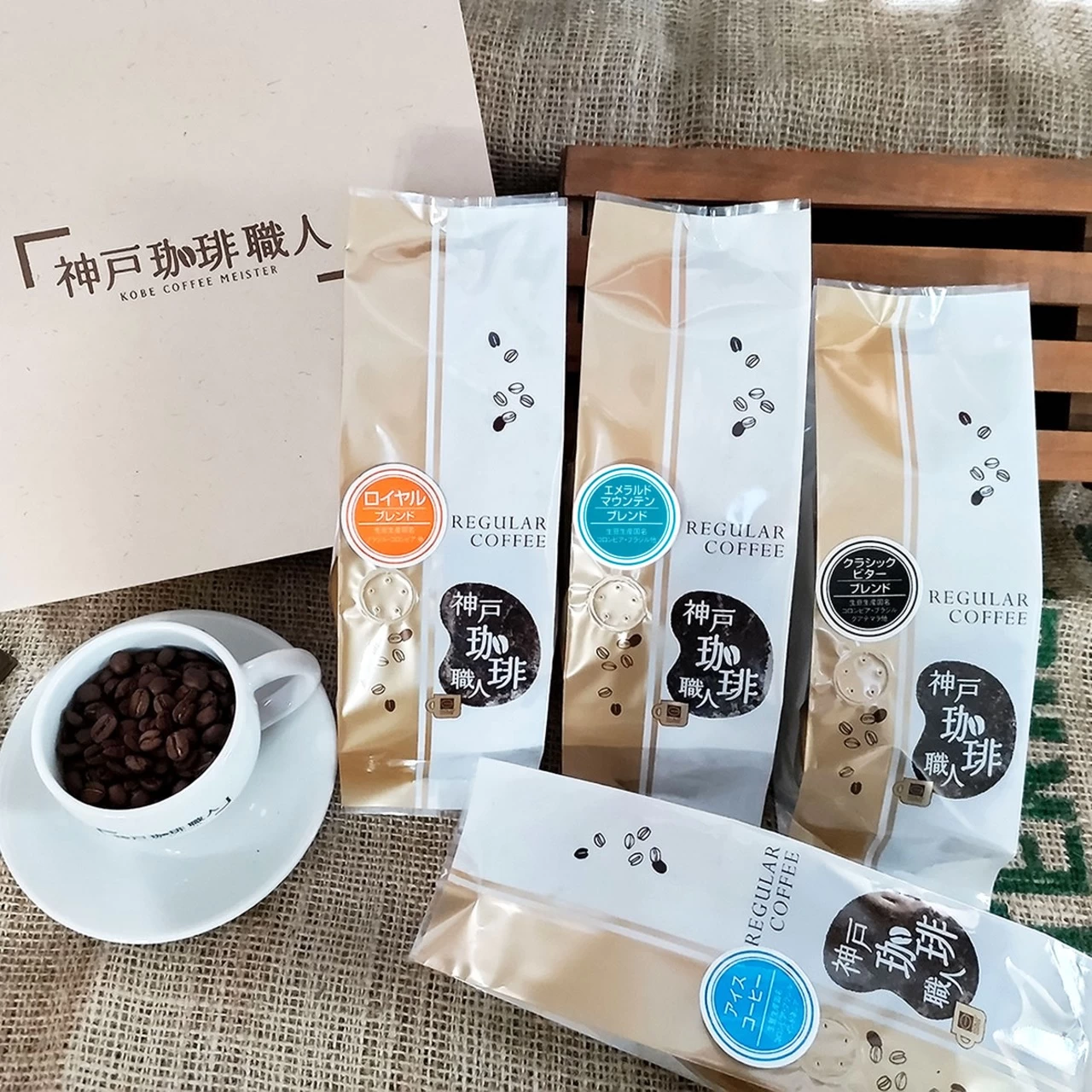 港町の喫茶店が育てた匠の味を『神戸珈琲職人』の名に託し、ご家庭でも気軽に楽しめるレギュラーコーヒーシリーズとしてお届けします。ロイヤルブレンド、クラシックビターブレンド、エメラルドマウンテンブレンド、アイスコーヒー。各1袋ずつ詰め合わせました。幅広い年齢層に親しまれる味わいで、大切な方への贈り物にもおすすめです。