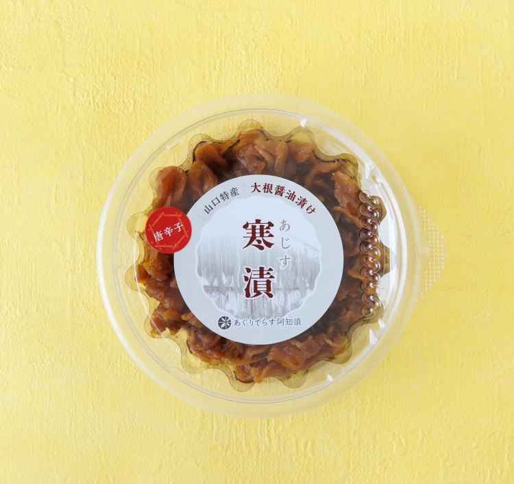 半年間大根を発酵させ、しょうゆ・みりんで甘辛く漬けており、ポリポリとした食べ応えのある食感と独特な風味が特徴。