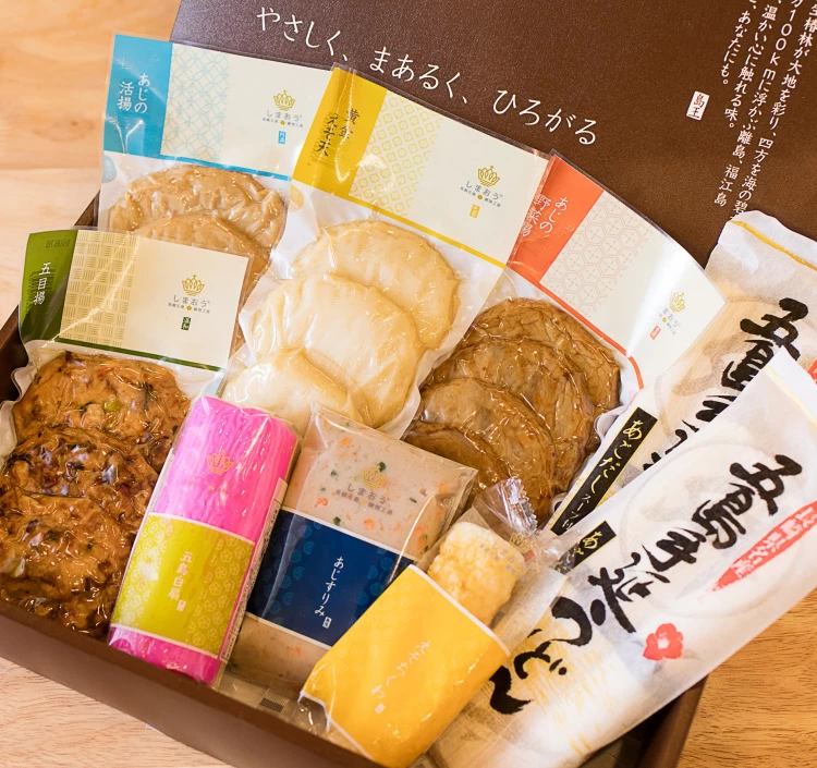 | 内容量 | 五島うどんあごだしスープ付×2 あじの活揚、 あじ野菜揚、 五目揚、 えそちくわ、 島小板、 島すりみ鯵(野菜入)、 黄金えそ天 |