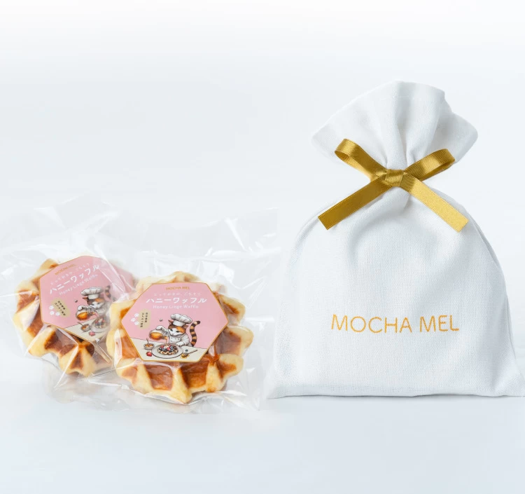 モカメルの「ハニーワッフル」2個を、ギフトポーチに詰め込んだギフトセット。っとりとした甘さとコクが魅力です。広がるはちみつの芳醇な香りが、ひとくちごとに至福のひとときをお届けします。