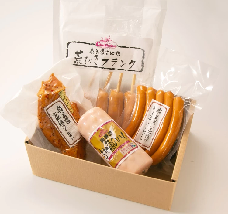 | 内容量 | 奥美濃古地鶏ハム360g×1 、奥美濃古地鶏ウィンナー150g×1 、奥美濃古地鶏むねパストラミ150g×1 、奥美濃古地鶏フランク320g×1 |