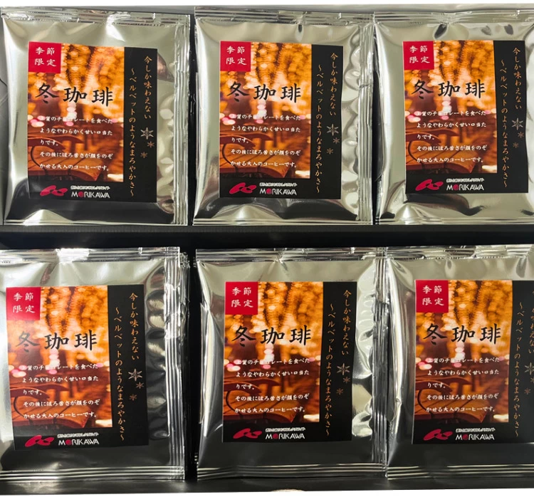 1927年から茶葉とコーヒー豆の販売を手がける「モリカワ」の自社工場でブレンド・焙煎したコーヒーです。寒い季節には少しほろ苦くしっかりとしたコクのある「冬珈琲」が最適。上質のチョコレートを食べたようなやわらかく甘い口当たりとほろ苦さが特徴です。