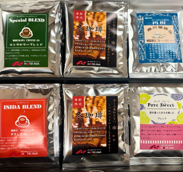 | 内容量 | ドリップバッグコーヒー MORIKAWAスペシャルブレンド 10g×5P ISIDA BLEND 10g×5p 昭和コーヒー 10g×5p ピュアスイート 10g×5P 冬珈琲 10g×5p(計30p入) |