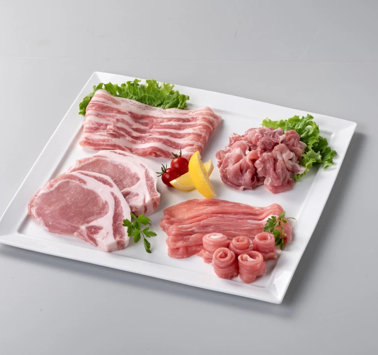 | 内容量 | ①館ヶ森高原豚 ロース肉切身 150g×2 ②館ヶ森高原豚 バラ肉スライス 150g ③館ヶ森高原豚 モモ肉しゃぶしゃぶ用 150g ④館ヶ森高原豚 切り落とし 150g |