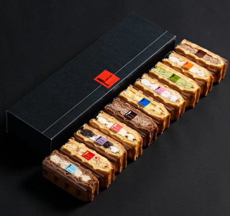 こだわりのワッフル生地をふんわりと焼き上げてフルーツやクリームをサンドした逸品。プレーンやバニラカスタード、チョコなどの定番のフレーバーが一度に味わえるお得なセットです。