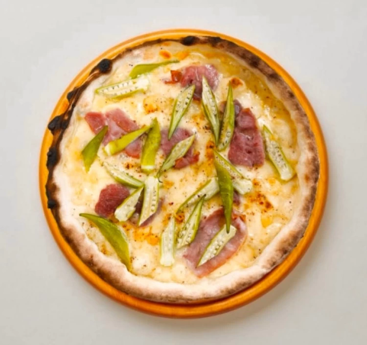 ・丸オクラと無添加ハム、無添加チーズの調和が光る特別なピザです。