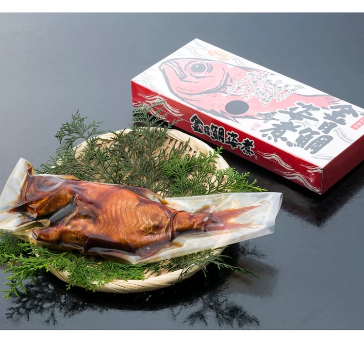 国産の脂ののった金目鯛を一匹姿煮にいたしました。豪快な姿煮をぜひご賞味ください。