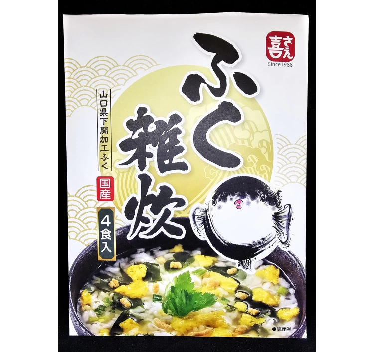 本場下関より自社加工した国産のふくを、専門メーカーと共同開発した特別な雑炊の素を作りました。