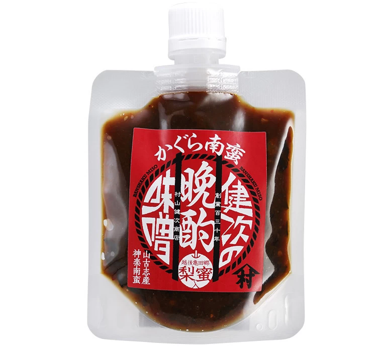 亀田郷特産の梨かの果汁をじっくりと煮詰めて作られた「梨みつ」を使用し、昔ながらの製法で仕上げたこだわりのおかず味噌。手作り味噌ならではの深い旨味に、山古志産のかぐら南蛮がピリッと効いた、まろやかな口あたりが特徴です。