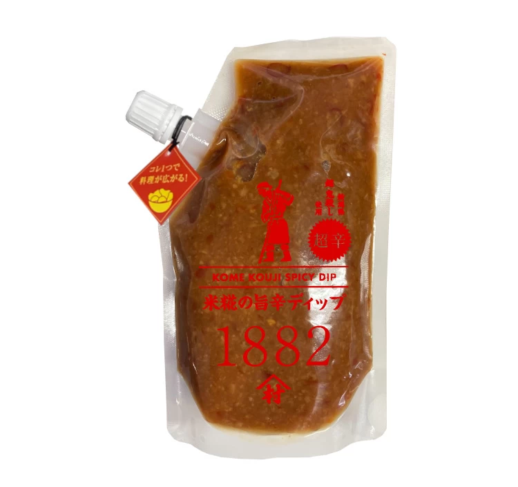 新潟米と自社ブレンドの糀菌で仕込んだ糀を使用した、旨み豊かな糀調味料。新潟の激辛一味唐辛子「超鬼殺し」を加えた“超辛”タイプで、刺激的な辛さの中にも糀ならではのまろやかなコクが感じられる味わい。糀・醤油・唐辛子のバランスが絶妙で、食材本来の旨みをしっかりと引き立ててくれるのも魅力。マヨネーズと合わせてディップにしたり、野菜炒めやそうめんつゆに加えたりと幅広く活用でき、冷蔵庫に常備しておくと便利な万能調味料。