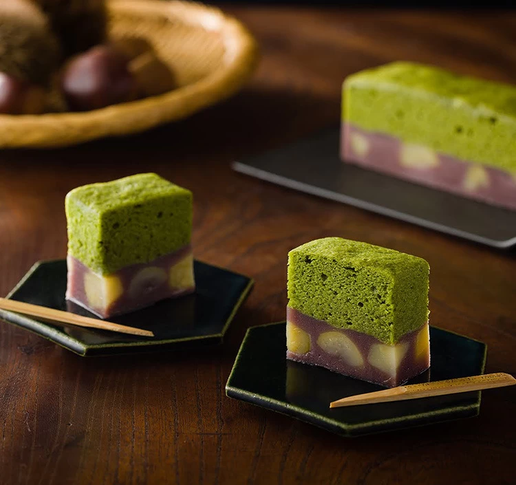 ふっくらと膨らんだ姿が「浮島」のようだと命名された和菓子。きみくらの浮島は、たっぷり栗を敷き詰めた栗蒸し羊羹と、白あんに自社製抹茶を贅沢に練り込んだ濃厚な和風蒸しケーキを重ねた2層仕立てです。