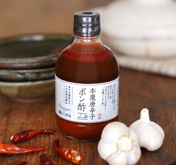 香川県産にんにくと小豆島醤油を贅沢に使用し、小豆島醤油職人によって丹精込めて作られています。爽やかな酸味の後に続く生にんにくならではの風味と香りが一度食べるとクセになる美味しさです。寄せ鍋・湯豆腐・ステーキ・鰹のたたき・サラダ・餃子・焼き魚など、季節を問わずご使用いただけます。