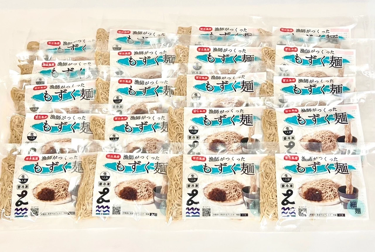 宮古島のもずく漁師が宮古島の中でもプレミアもずくの来間島産もずくを厳選し、製麺所に特注して作りました。
