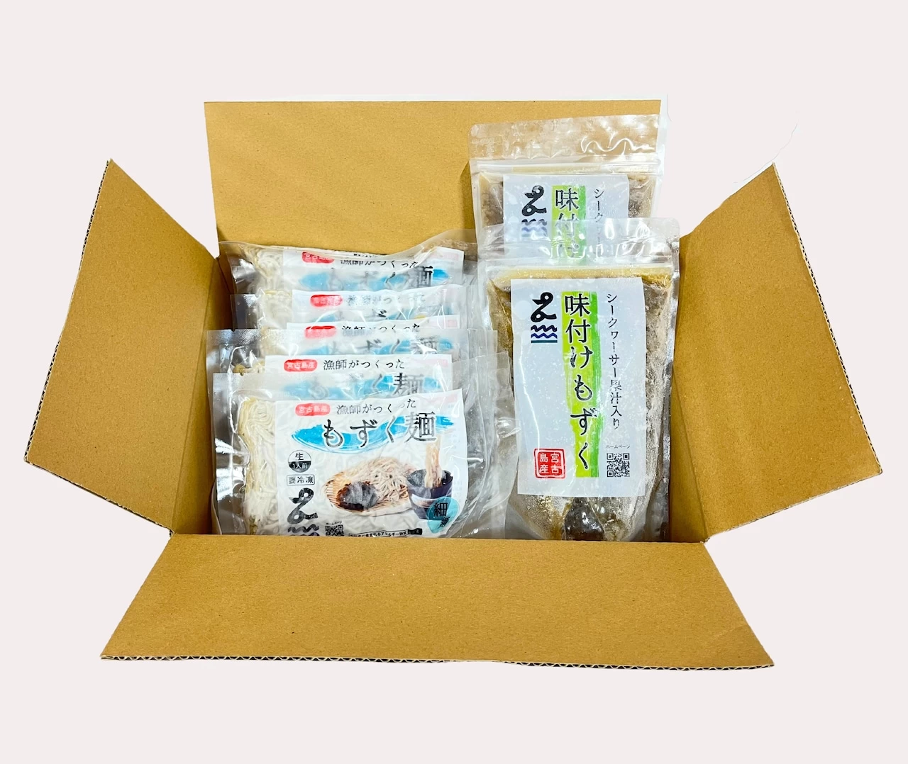 宮古島のもずく漁師が宮古島の中でもプレミアもずくの来間島産もずくを厳選し、製麺所に特注して作りました。