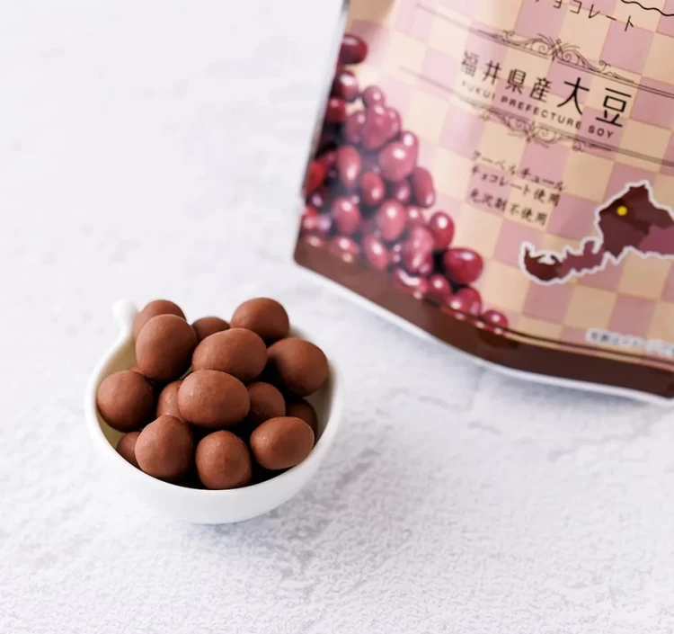 福井県産大豆を香ばしくポン菓子にし、なめらかなクーベルチュールチョコレートで包み込みました。 植物油脂を使わず、カリッとした食感と大豆の旨みを引き立てた、からだにうれしいチョコスナックです。