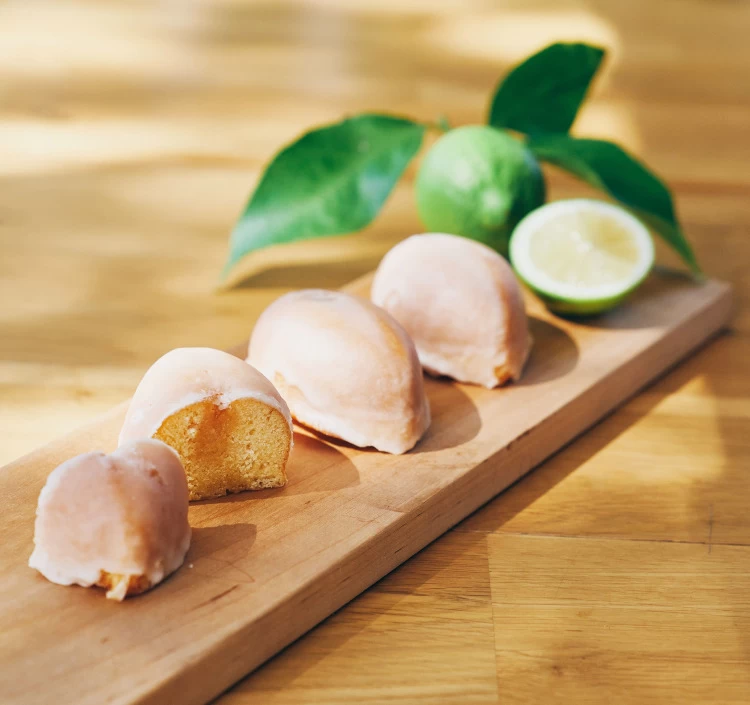 生地の中に地元・大阪府泉南郡熊取町で育てられたレモンを使用したジャムを詰め込んで、表面をレモングレーズでコーティングした、丸くてかわいいレモン型のケーキ。レモンのさわやかな香りと酸味を堪能できる、しっとりとした口当たりのケーキは、紅茶やコーヒーとの相性もぴったり。週末のリラックスしたひとときに味わいたい。“熊取町ブランド”にも認定されたレモンケーキは、贈答品や引き出物、手土産にも喜ばれる。