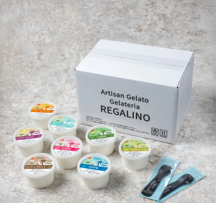 クリスマス島の天然塩・宇治抹茶・マンゴーミルク・ラムレーズン(各1個)、信州牛乳・チョコレート・ストロベリー・プレミアムピスタチオ(各2個)と8種類のジェラートが楽しめるセット。素材の持ち味を活かしたジェラートは、贈り物にも喜ばれる。