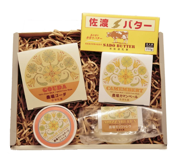 | 内容量 | クリームチーズ100g×1個、モッツアレッラチーズ100g×1個、カマンベールチーズ100g×1個、ゴーダチーズ200g×1個、佐渡バター有塩200g×1個 |