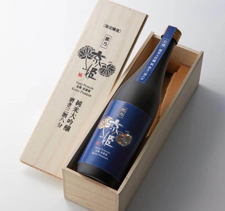 酒米「祝(いわい)」を使い、匠の技で醸された純米大吟醸。京都・伏見の清らかな水と豊かな風土に育まれたこのお酒は、繊細で優雅な香りとやわらかな口当たりが魅力で、上品な甘みとすっきりした酸味が調和し、芳醇で気品ある味わいに仕上がっています。ラベルデザインは「源氏物語」の紫の上と葵祭をモチーフに、双葉葵のはく押しを施すことで姫君の優美さと京都らしさを表現。京都らしい逸品として、お土産やギフトにも最適です。