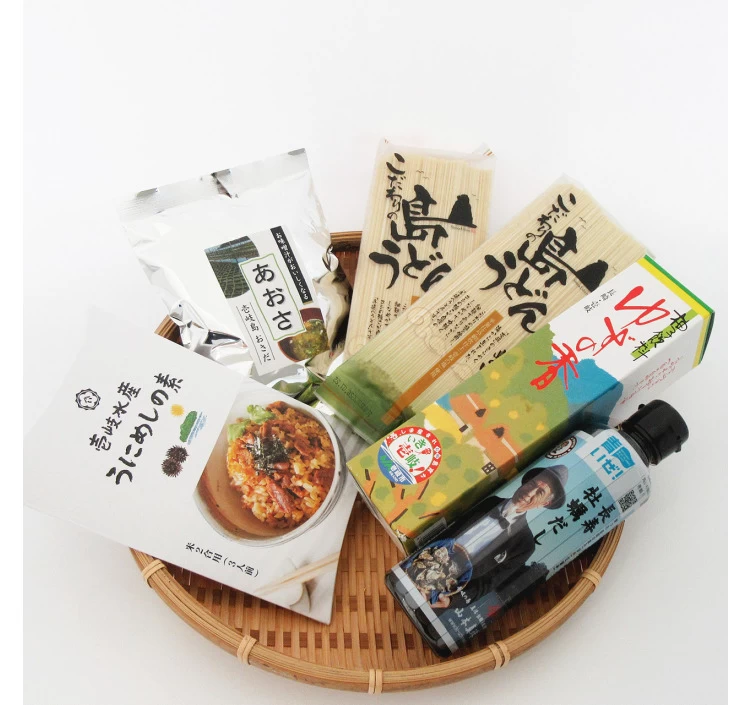 | 保存期間 | うにめしの素_常温3ヶ月 島うどん_常温1年 乾燥あおさ_常温4ヶ月 ゆずの香_常温1年 長寿牡蠣(かき)だし_常温1年 |