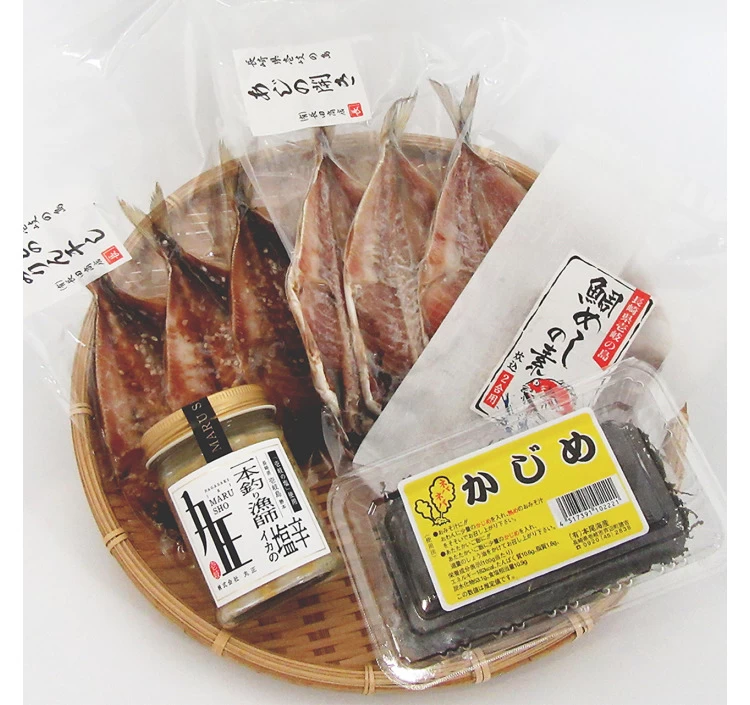| 内容量 | あじみりん×3枚 あじの開き×3枚 イカの塩辛ビン入130g×1本 たいめしの素 2合用 半生かじめ 55g×1個 |