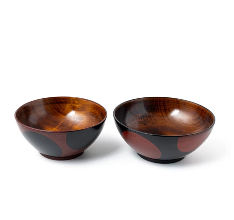 1917年創業、香川漆器の老舗工房が手がけた水玉柄の夫婦茶椀。国の伝統的工芸品・香川漆器の5つの技法“蒟醤(きんま)・彫漆(ちょうしつ)・存清(ぞんせい)・後藤塗(ごとうぬり)・象谷塗(ぞうこくぬり)”のうち、後藤塗の手法を応用して作られた茶碗で、何度も何度も塗り重ねた漆の上に描かれた水玉はすべて職人によって手描きされている。一つ一つ職人によって作られたあたたかみを感じることができる。中の温度が緩やかに伝わる木製漆器は、熱い飲み物も冷たい飲み物も、手に持ったときにちょうどよくじんわり温度が伝わり、手になじみの良い質感が特徴だ。夫婦茶碗は、結婚祝いやご両親への贈り物にぴったり。