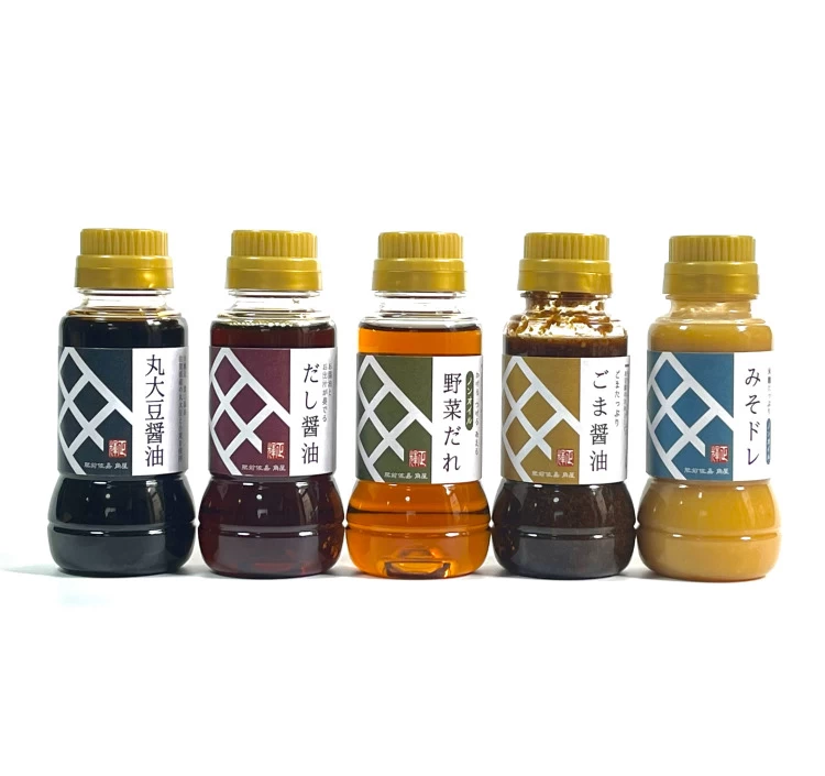 | 内容量 | 丸大豆醤油ミニ150ml、だし醤油ミニ150ml、野菜だれミニ150ml、ごま醤油ミニ180g、みそドレミニ180g |