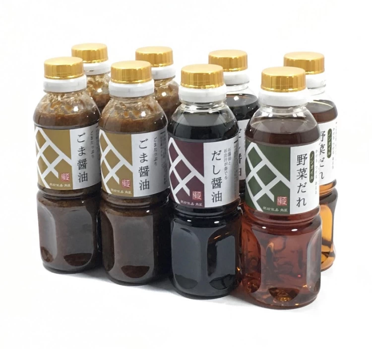 | 内容量 | 【基本セット】ごま醤油360g×4本,だし醤油300ml×2本,野菜だれ300ml×2本 ※ごま醤油をみそドレに変更可能 |