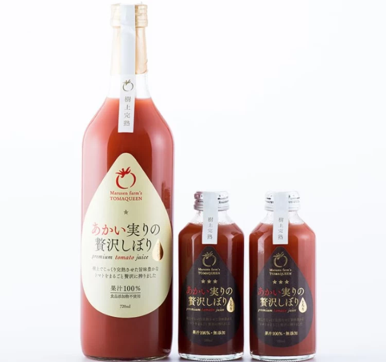 他では類を見ない、自家製堆肥(有機質とミネラルや微生物、米ぬかを入れ発酵させる)の健康な土壌で時間をかけて育てたトマクイーン。糖度8~9度の中玉を収穫後すぐに搾った果汁100%、食品添加物不使用のジュースです。
