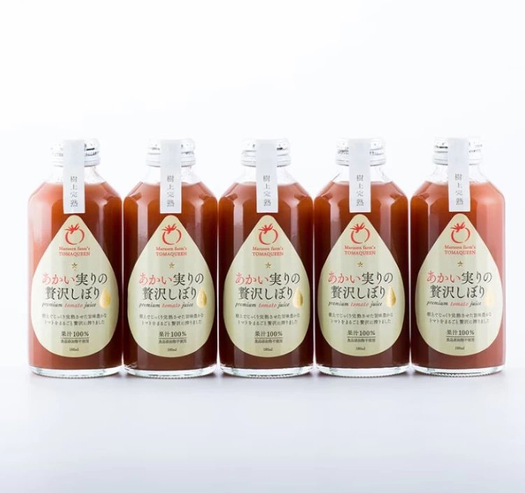 他では類を見ない、自家製堆肥(有機質とミネラルや微生物、米ぬかを入れ発酵させる)の健康な土壌で時間をかけて育てたトマクイーン。糖度8~9度の中玉を収穫後すぐに搾った果汁100%、食品添加物不使用のジュースです。