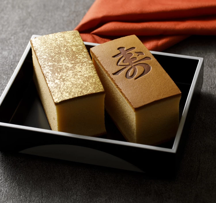 縁起の良い「寿」の焼印を施したかすていらと、華やかな金箔付きの組み合わせは、結婚のお祝いや敬老の贈り物としてもふさわしい品です。