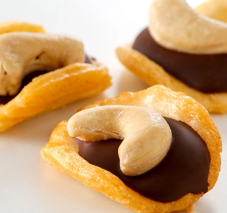 サクッと軽いおかきの上に、なめらかなチョコレートとカシューナッツをトッピング。甘さと塩味が絶妙に重なり合う、ちょっと意外でクセになる美味しさです。ひと口食べれば、そのバランスの良さに思わず笑顔がこぼれる新感覚の味わいをお楽しみください。