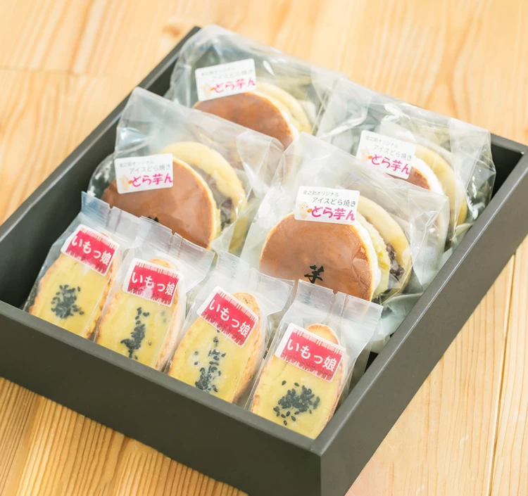 ボリュームたっぷりのどら芋んと、しっとり食感のいもっ娘をそれぞれ4個ずつ詰め合わせたギフトセット。