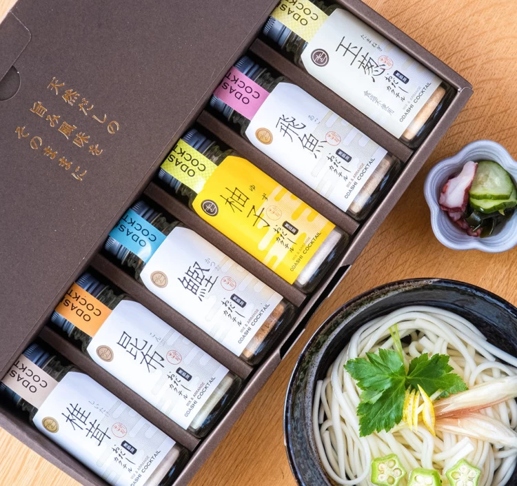 ゆずかつおをはじめ、椎茸や玉葱、鰹、昆布、あご(飛魚)といった多彩な旨みを楽しめる無添加の「おだしカクテル」6本セット。水冷臼式製法により、芳醇な香りとやさしい味わいを実現している。使い方はとても簡単で、料理に数回振りかけるだけ。味噌汁やうどん、おでんなど、いつもの一品が手軽に本格的な味わいへと変わる。だしを引く時間がない忙しい日常にも寄り添いながら、食卓をさりげなく格上げしてくれる。素材や製法にこだわる一品は、贈り物としても喜ばれるだろう。