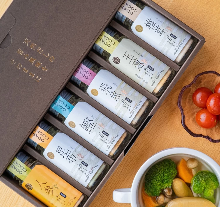 椎茸や玉葱、人参といった野菜のやさしい甘みと、鰹節や昆布、飛魚の豊かな旨みを組み合わせた無添加の「おだしカクテル」6本セット。水冷臼式製法により、芳醇な香りとやさしい味わいを実現している。使い方はとても簡単で、料理に数回振りかけるだけ。味噌汁やうどん、おでんなど、いつもの一品が手軽に本格的な味わいへと変わる。だしを引く時間がない忙しい日常にも寄り添いながら、食卓をさりげなく格上げしてくれる。素材や製法にこだわる一品は、贈り物としても喜ばれるだろう。