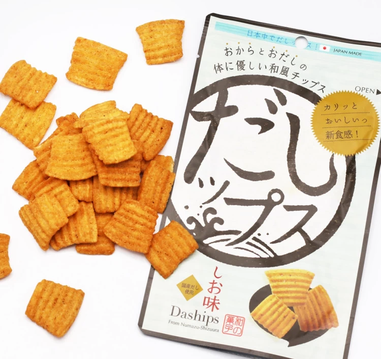 だしの旨みを活かした、やさしいしお味が特徴の無添加スナック「だしップス」。素材本来の風味を大切にし、軽やかな食感とともに自然な美味しさを楽しめる一品に仕上げている。おやつや小腹が空いたときにも手軽に取り入れられ、子どもから大人まで幅広く楽しめるのも魅力。シンプルながら奥行きのある味わいが、日常のひとときを少し豊かにしてくれる。安心して味わえる、新しいだしの楽しみ方だ。