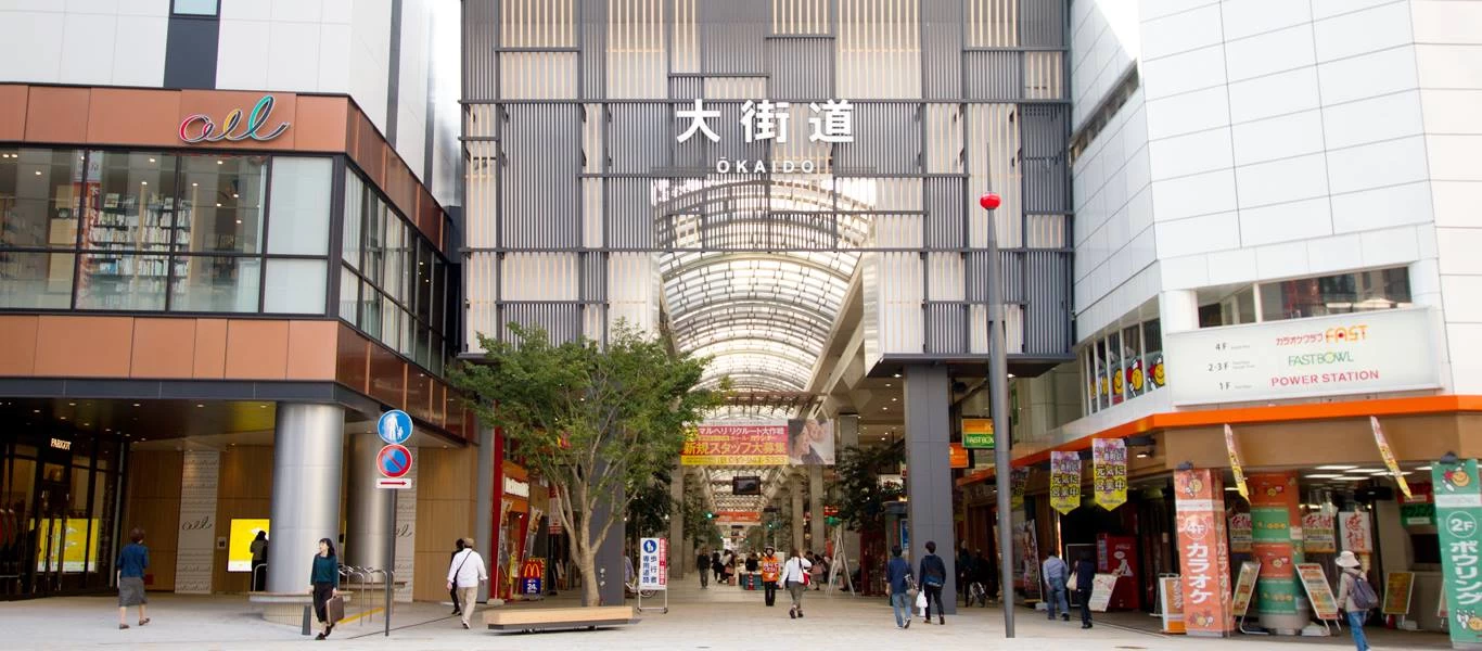 松山市駅前の「松山銀天街(ぎんてんがい)」を抜け、千舟町(ちふねまち)通りを渡ると再びアーケード商店街が登場。こちらが「大街通」で、高さ13mの自動開閉3段式アーケードに約130店舗が並ぶ。夏に開催される土曜夜市では、多数の屋台が出て賑わう。