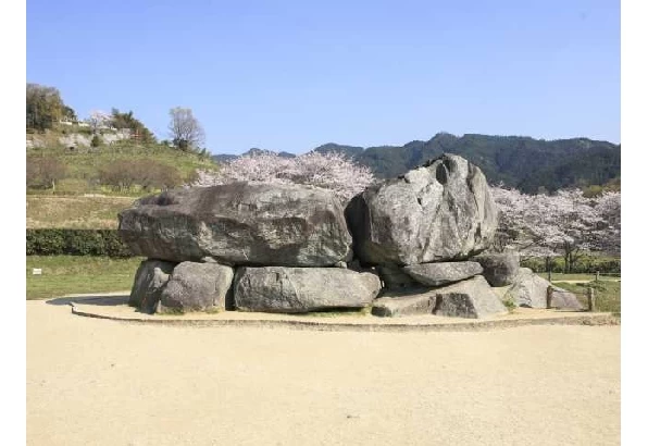 巨石を積んだ石室が露出した墳墓。盛り土は失われたが、濠に囲まれた日本最大級の石室を持つ方墳( 平面形が方形の墳丘をもつ古墳)といわれており、国の特別史跡に指定されている。棺が安置されていた玄室に入ることができ、長さ約7.7m、幅約3.4m、高さ約4.8mのスケールに圧倒される。