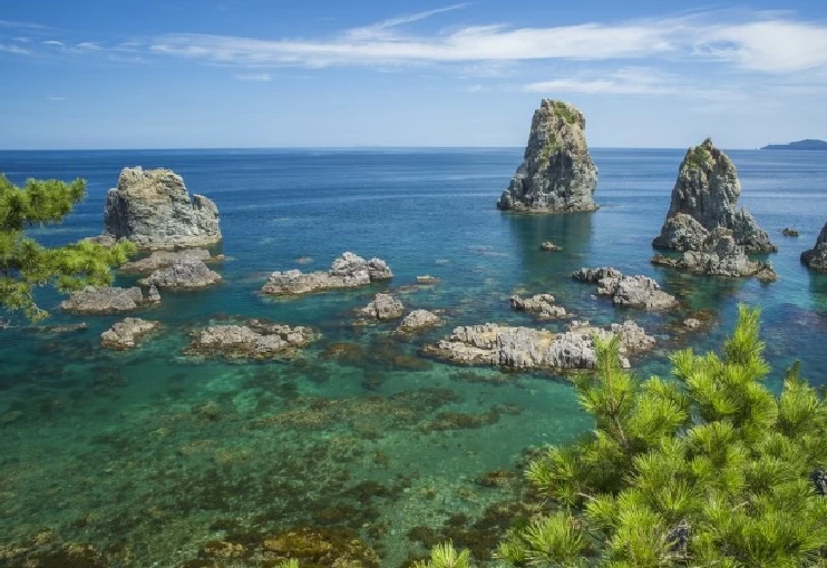 - ★ 山口県北西部に位置する周囲約40kmの島「青海島」。北長門海岸国定公園を代表する景勝地で、島の東部や北部、西部は奇岩怪石が連なりダイナミックな景観が広がります。北西部は「日本の渚百選」にも選ばれているんです