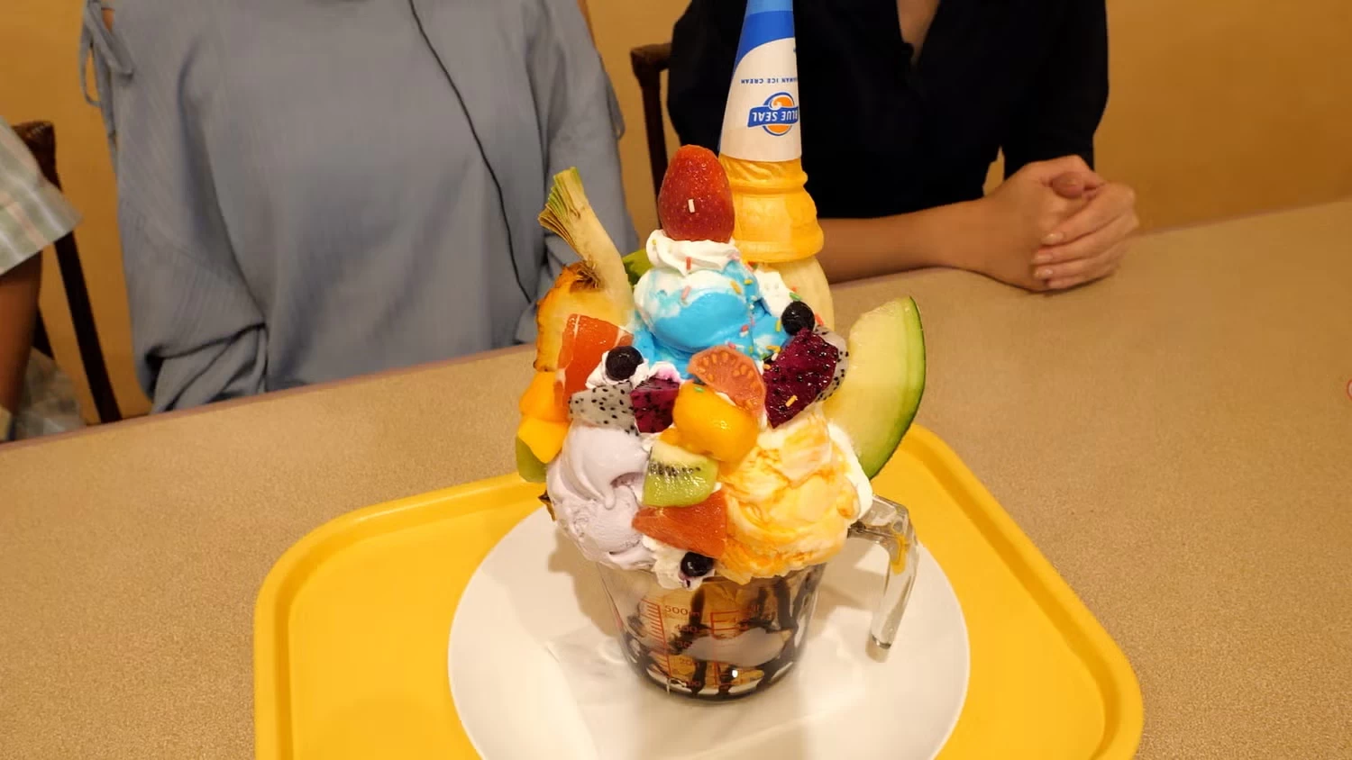 - ★ 特におすすめしたいのが、旬のフルーツを使ったメニューが豊富な「FRUITS CAFE」の「フルーツアドベンチャー」。 季節のフルーツや沖縄生まれのアイスメーカー「ブルーシールアイス」がなんと6種類も盛られているパフェで、その総重量は約1.5kg! たくさんのフルーツといろんな味のアイスを交互に食べることで、飽きが来ずあっという間に完食できちゃいます